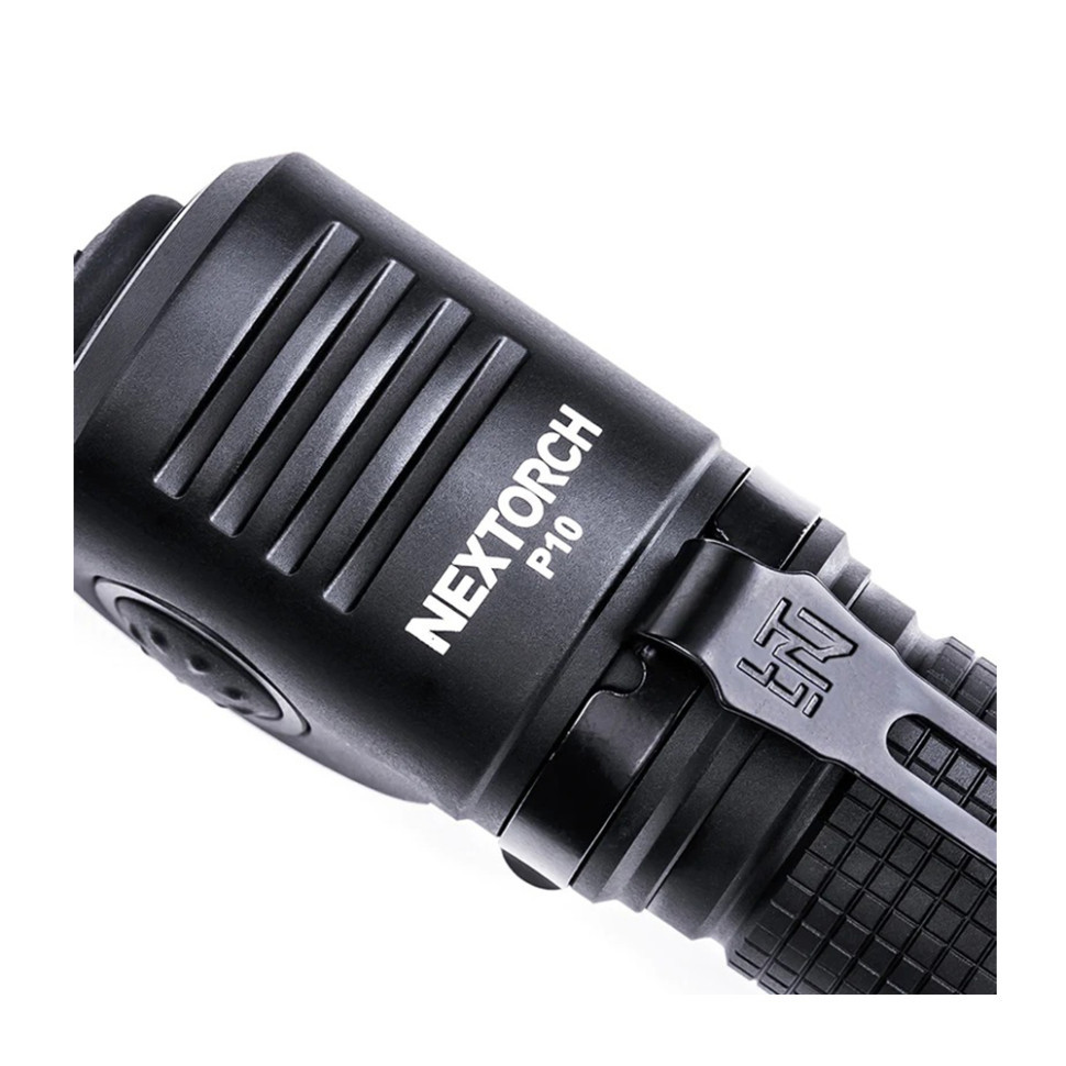 Ліхтар Nextorch P10 є тактичним приладом, що дає яскравість світла 1400 люменів. Дальнобійність – 200 метрів. Три джерела світла: білий, червоний та синій, а також 8 режимів освітлення. У комплект з ліхтарем входить затискач із нержавіючої сталі, що допомагає прикріпити його до MOLLE, кишені, лямки рюкзака, що забезпечує використання без допомоги рук.