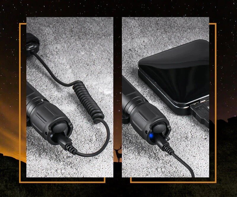 Заряджається ліхтар через USB-порт. Дистанційний перемикач, що швидко підключається, має той же водонепроникний порт, що і система зарядки USB, в результаті додаткова хвостова частина не потрібна. Кількість режимів роботи – 7.