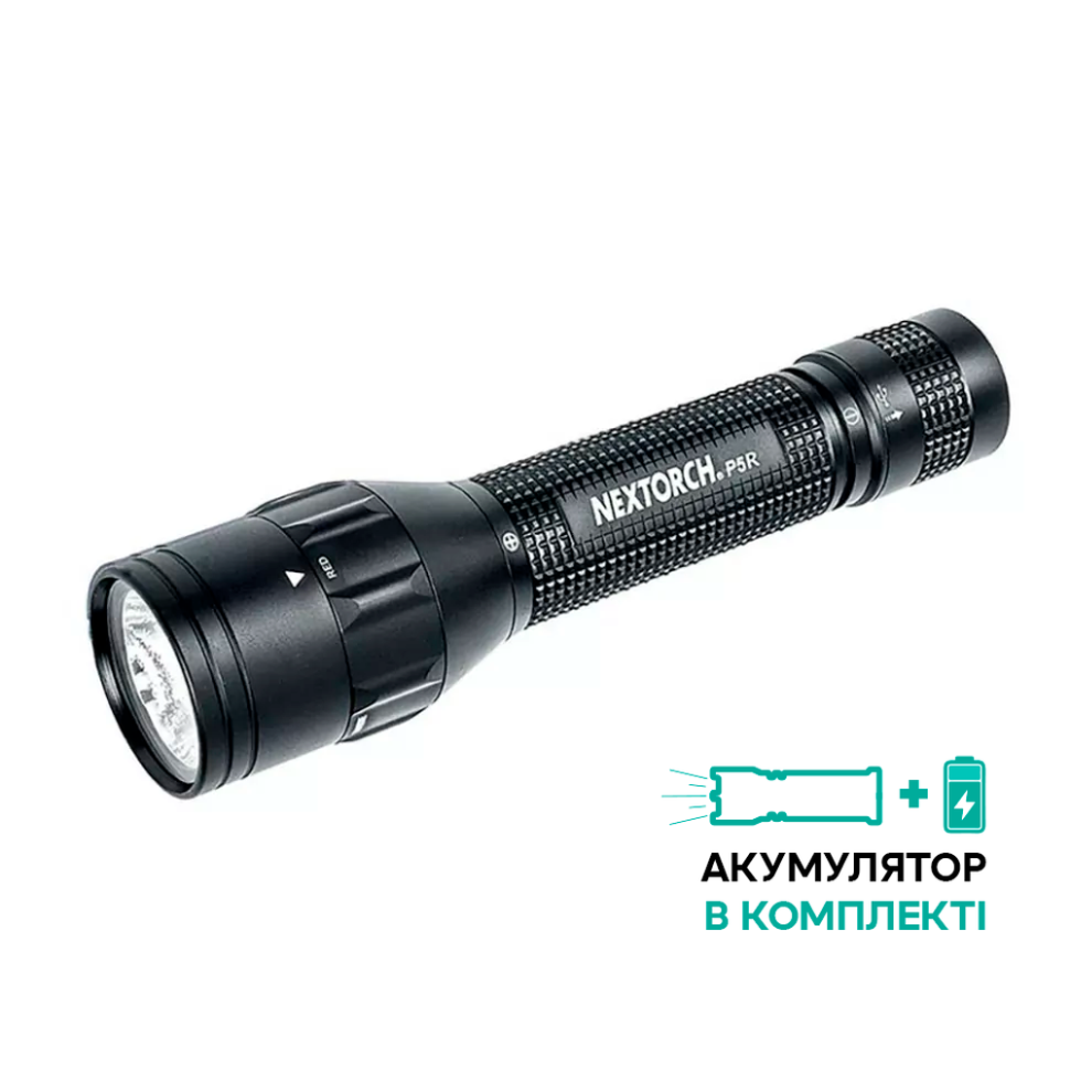 Опис Ліхтар ручний Nextorch P5R чорний Ручний ліхтар Nextorch P5R забезпечує максимальну яскравість освітлення 800 люменів при дальності 246 метрів променя. Діоди, що використовуються: CREE XP-L V5 / червоний світлодіод XP-E2. Дає біле та червоне освітлення. Живлення від батарейки 18650 також можуть підійти дві батарейки CR123A.