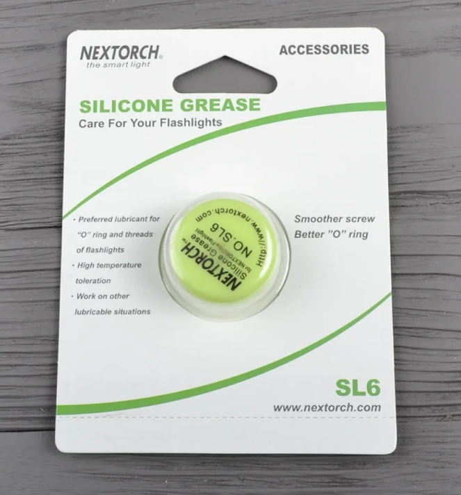 Опис силіконового масла Nextorch SL6: Силіконова мастило призначена для догляду за ліхтарями, лазерами та іншими приладами, у яких є різьблення. Мастило значно знижує знос виробів, усуває скрипи і продовжує термін служби механізмів. Крім того нею можна змащувати не тільки різьбові з'єднання, але і силіконові кільця в будь-яких типах ліхтарів. При цьому вона не роз'їдає силікон і має високу стійкість до високих температур.